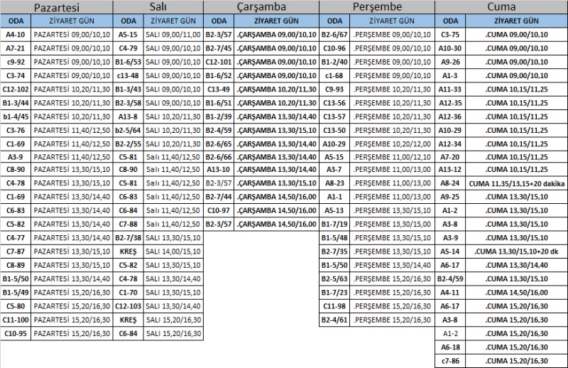 2025 YILI ARALIK AYI AÇIK GÖRÜŞLERİ 15-19 ARALIK 2025 HAFTASINDA YANDA BELİRTİLEN GÜN VE SAATTE YAPILACAKTIR. HÜKÜMLÜ VE TUTUKLULAR GÖRÜŞ YAPMA YETERLİLİĞİ OLAN EN FAZLA 10 KİŞİ TARAFINDAN ZİYARET EDİLECEKTİR.HÜKÜMLÜ/TUTUKLUNUN DİSİPLİN CEZASI İNFAZI SÜRÜYOR İSE SÖZ KONUSU DİSİPLİN CEZASININ HÜKÜMLERİ UYGULANIR. HÜKÜMLÜ VE TUTUKLULAR ODA DEĞİŞİKLİĞİ YAPSALAR BİLE VERİLEN AÇIK GÖRÜŞ GÜN VE SAATLERİ GEÇERLİDİR. PLANLANAN AÇIK GÖRÜŞ GÜN VE SAATİNDE GELMEYEN ZİYARETÇİLERE GÖRÜŞ YAPTIRILMAYACAKTIR. ZİYARET PROGRAMINDA HERHANGİ BİR DEĞİŞİKLİK OLDUĞU TAKTİRDE TARAFINIZA BİLGİ VERİLECEKTİR.