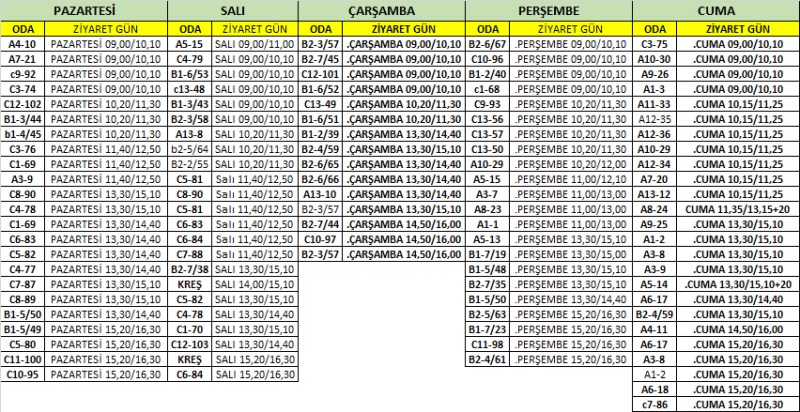 2026 YILI OCAK AYI AÇIK GÖRÜŞLERİ 26-30 OCAK 2026 HAFTASINDA YANDA BELİRTİLEN GÜN VE SAATTE YAPILACAKTIR. HÜKÜMLÜ VE TUTUKLULAR GÖRÜŞ YAPMA YETERLİLİĞİ OLAN EN FAZLA 10 KİŞİ TARAFINDAN ZİYARET EDİLECEKTİR.HÜKÜMLÜ/TUTUKLUNUN DİSİPLİN CEZASI İNFAZI SÜRÜYOR İSE SÖZ KONUSU DİSİPLİN CEZASININ HÜKÜMLERİ UYGULANIR. HÜKÜMLÜ VE TUTUKLULAR ODA DEĞİŞİKLİĞİ YAPSALAR BİLE VERİLEN AÇIK GÖRÜŞ GÜN VE SAATLERİ GEÇERLİDİR. PLANLANAN AÇIK GÖRÜŞ GÜN VE SAATİNDE GELMEYEN ZİYARETÇİLERE GÖRÜŞ YAPTIRILMAYACAKTIR. ZİYARET PROGRAMINDA HERHANGİ BİR DEĞİŞİKLİK OLDUĞU TAKTİRDE TARAFINIZA BİLGİ VERİLECEKTİR.AİLE FERTLERİNİZ ZİYARET KABUL BİRİMİNDEN ZİYARET GÜN VE SAATİ KONUSUNDA BİLGİ ALABİLİR.