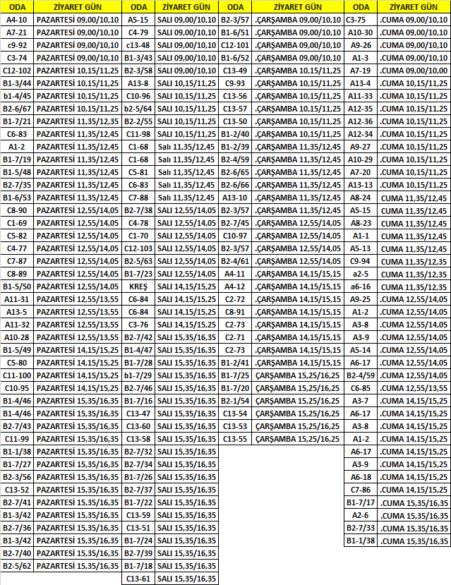 2026 YILBAŞI MÜNASEBETİYLE YAPILACAK AÇIK GÖRÜŞLER 29-30-31 ARALIK 2025 VE 2 OCAK 2026 TARİHLERİNDE YANDA BELİRTİLEN GÜN VE SAATTE YAPILACAKTIR.(BAYRAM VE ÖZEL GÜNLERDE YAPILACAK ZİYARET ESASLARINA GÖRE ZİYARETÇİ KABULUNDEN YOKSUN BIRAKMA VE HÜCRE CEZASI İNFAZ EDİLMEKTE OLANLAR BU GÖRÜŞLERDEN FAYDALANAMAYACAK OLUP (VASİDE GİREMEZ) AÇIK GÖRÜŞ YAPAMAYACAKTIR.) ANCAK ZİYARETTEN MEN CEZASI İNFAZ EDİLMEKTE OLAN (AĞIR MÜEBBET HÜKÜMLÜSÜ OLMAYANLAR) YANDA BELİRTİLEN GÜN VE SAATTE VASİ İLE HAFTALIK KAPALI ZİYARET HAKKINI KULLANABİLİR. GELEN YAZIYA İSTİNADEN BAYRAM VE ÖZEL GÜNLER MÜNASEBETİYLE VERİLEN AÇIK GÖRÜŞLERDE AĞIR MÜEBBET CEZASI İNFAZ EDİLMEKTE OLAN HÜKÜMLÜLER VASİ İLE AÇIK GÖRÜŞ YAPAMAYACAKTIR.HÜKÜMLÜ VE TUTUKLULAR ODA DEĞİŞİKLİĞİ YAPSALAR BİLE VERİLEN AÇIK GÖRÜŞ GÜN VE SAATLERİ GEÇERLİDİR. PLANLANAN AÇIK GÖRÜŞ GÜN VE SAATİNDE GELMEYEN ZİYARETÇİLERE GÖRÜŞ YAPTIRILMAYACAKTIR. ZİYARET PROGRAMINDA HERHANGİ BİR DEĞİŞİKLİK OLDUĞU TAKTİRDE TARAFINIZA BİLGİ VERİLECEKTİR.